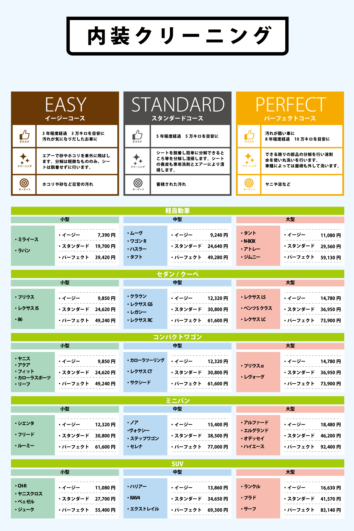 車内の汚れを丁寧にクリーニング、3つのコースからお選び頂けます。